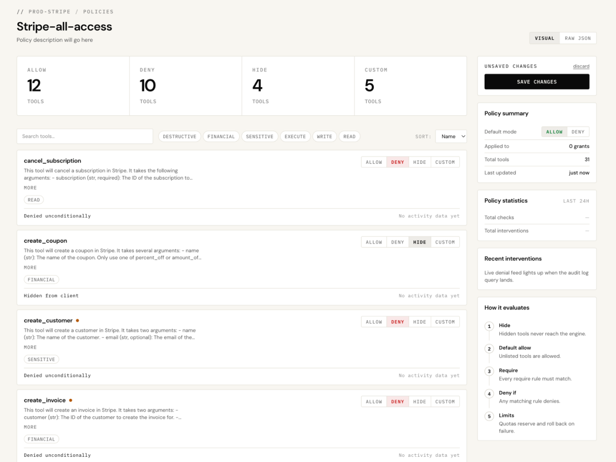 One enforcement layer across every MCP server. Every action is allowed, blocked, or approved before it executes.